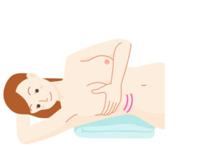 Legen Sie sich auf den Rücken, legen Sie ein Kissen unter die entsprechende Schulter und den Arm hinter den Kopf. Tasten Sie die Brust wie zuvor beschrieben — im Liegen verteilt sich das Gewebe anders und Auffälligkeiten lassen sich oft leichter ertasten. Wiederholen Sie die Untersuchung auf der anderen Seite.
